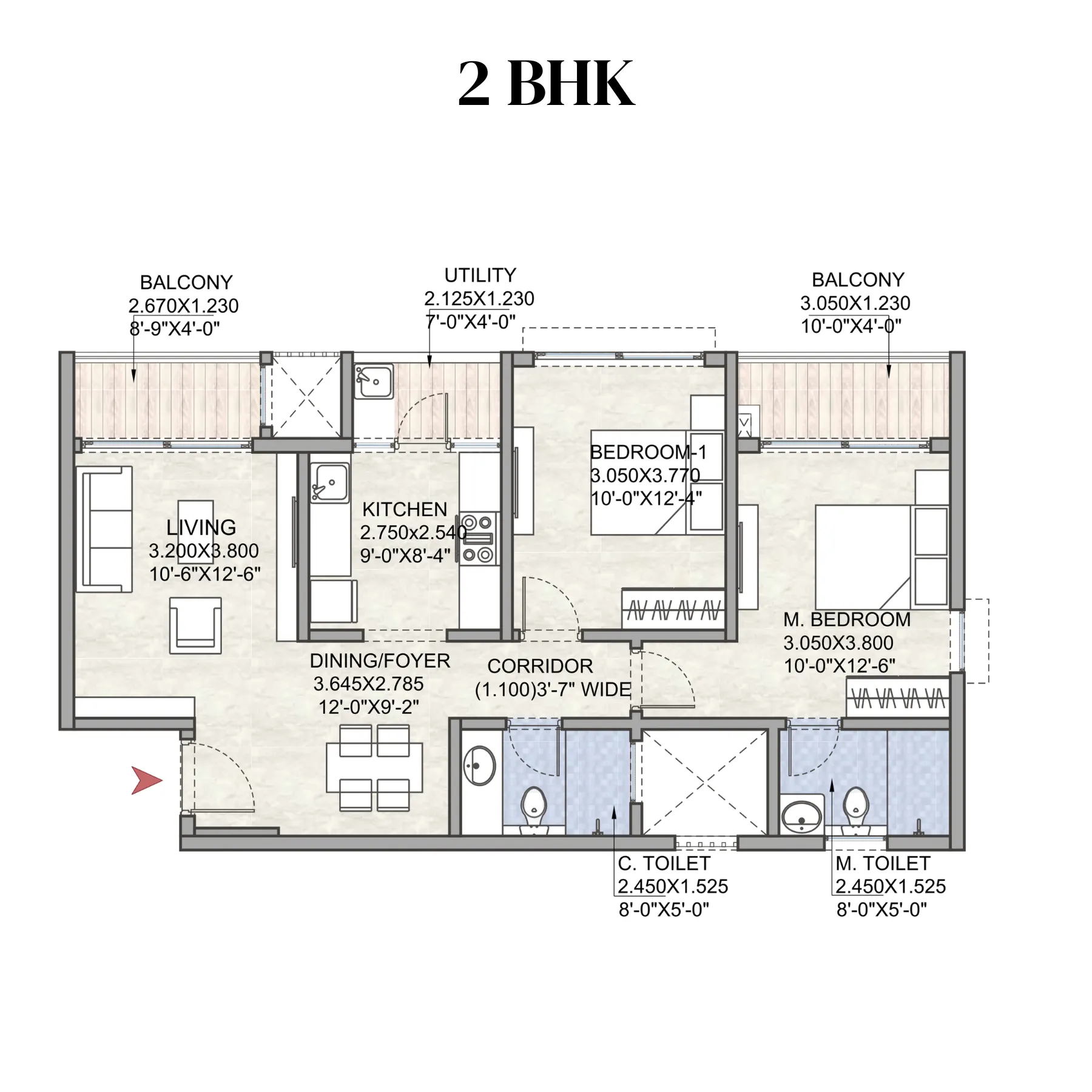 This 2 BHK layout is planned for homeowners seeking new apartments in Bangalore that balance comfort with efficient design. The living area opens to a generous balcony, bringing natural light and steady ventilation—an advantage for 2 BHK flats in North Bangalore. The dining and kitchen sit together for smooth daily flow, supported by a compact utility zone. Both bedrooms are well-planned, with the master set away from the social zone for added privacy. A short central corridor keeps circulation simple and avoids wasted space. With dual balconies, clear zoning and a bright, airy ambience throughout, this home is ideal for young families or first-time buyers exploring new apartments for sale in Bangalore.
